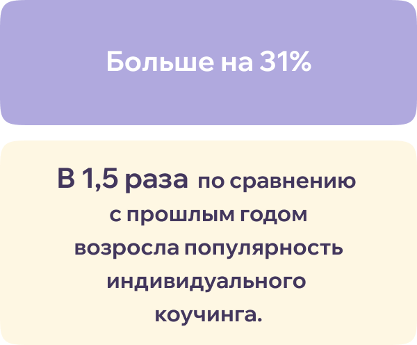 Компании активно продолжают поддерживать персонализированный подход к развитию ключевых сотрудников. Индивидуальный коучинг, который максимально адаптирован под обстоятельства и текущие потребности участника сессии, обеспечивает высокую релевантность и практическую ценность для его профессионального и личного развития.