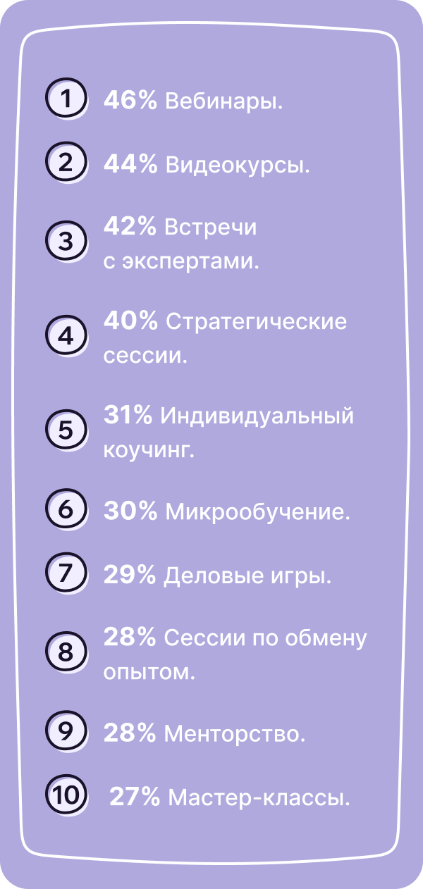 Именно поэтому L&D-специалисты стараются применять комбинированные подходы, сочетающие микрообучение с другими форматами, такими как тренинги, вебинары, видеокурсы, встречи с экспертами, сессии по обмену опытом.
