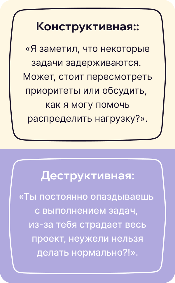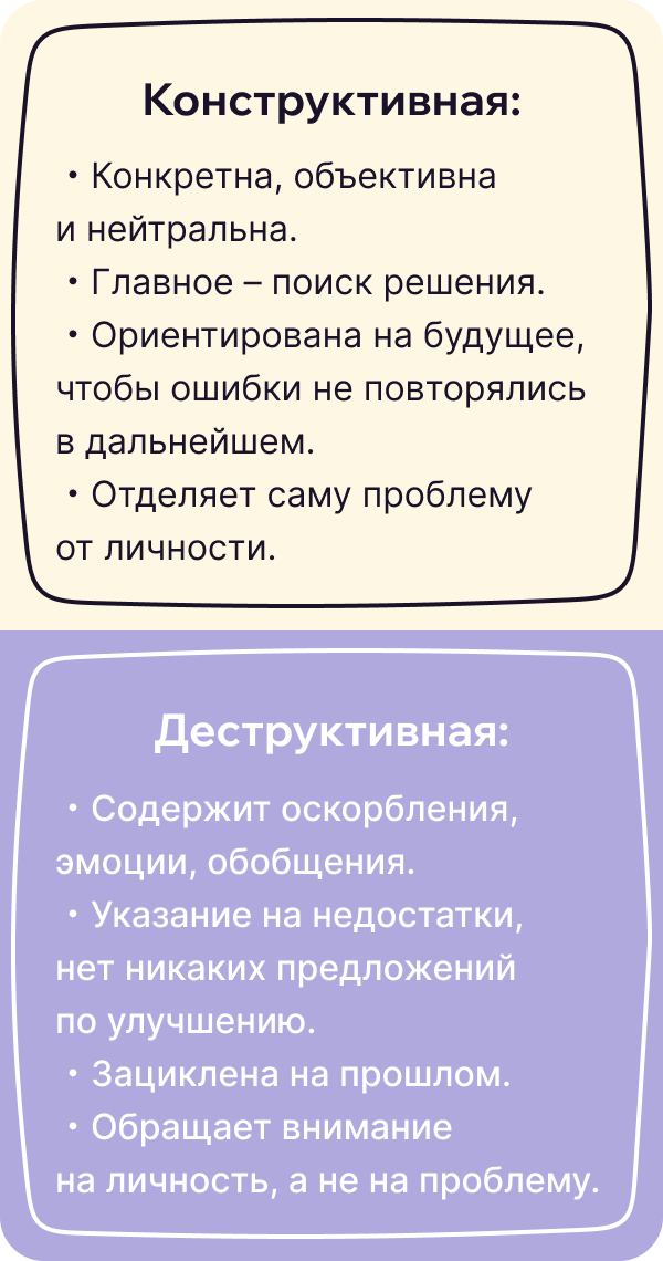 Конструктивная помогает развиваться и улучшать навыки, в то время как деструктивная направлена на унижение и манипуляцию. Постарайтесь понять, почему человек критикует вас. Возможно, он хочет помочь или же просто проявляет высокомерие.