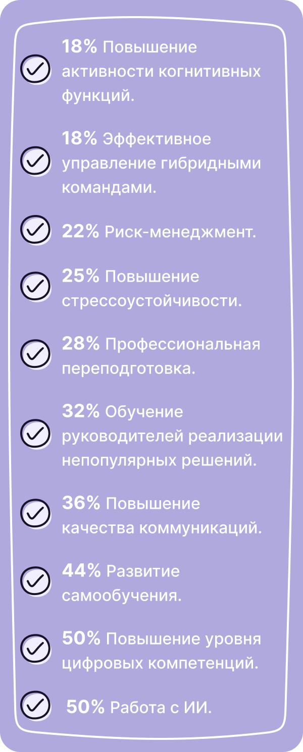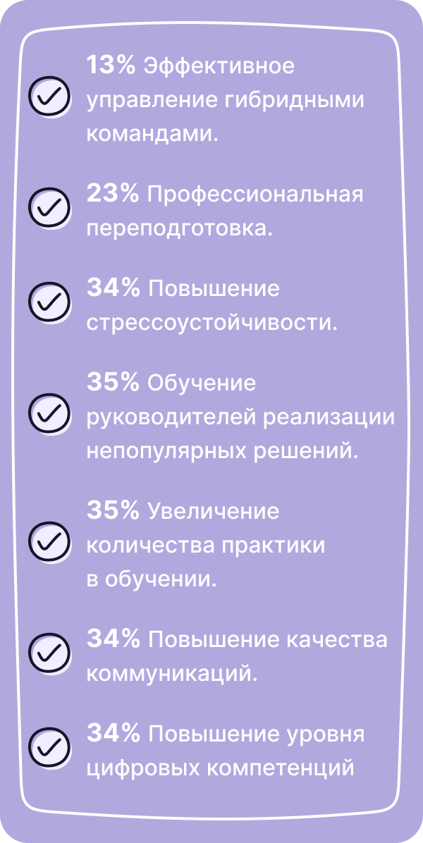Помимо предложенных вариантов, часть респондентов отметила важность повышения эффективности дистанционного обучения линейного персонала. Зачастую сотрудники совмещают онлайн-обучение и рабочие задачи, в связи с чем качество обучения снижается. Поэтому важно проводить внутреннюю оценку результатов любого обучения.